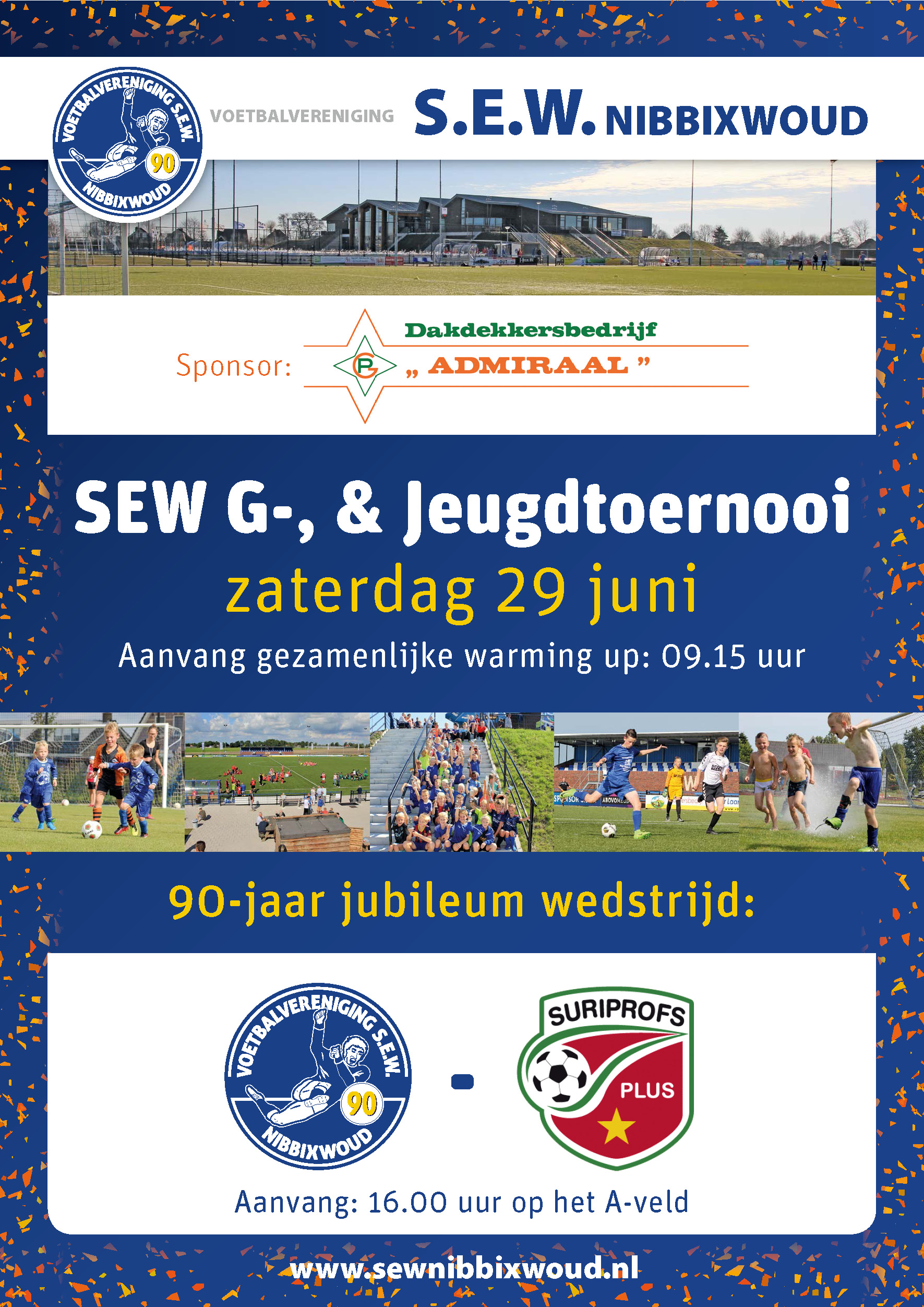Zaterdag 29 juni Admiraal G- en Jeugdtoernooi met om 16.00 uur de Suriprofs tegen SEW 1 + (on-aangepast) programma